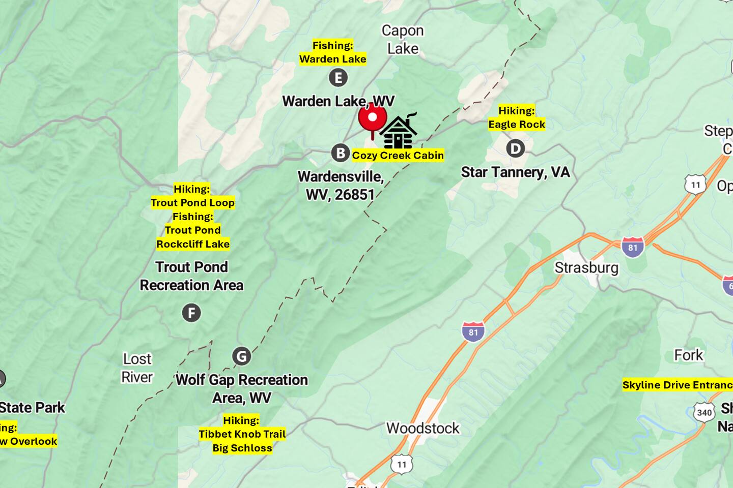 ๐ Your Private West Virginia Mountain Cabin | Relax, Explore & Reconnect ๐ ๐ Nearby Attractions: -๐ George Washington National Forest โ endless hiking trails ๐ฅพ, fishing ๐ฃ & scenic wilderness minutes away -๐ Lost River State Park โ swimming, hiking & horseback riding ๐ adventures -๐ Shenandoah National Park โ iconic Skyline Drive ๐ & breathtaking fall foliage views ๐ ๐ฃ Experience nature, comfort & family fun โ your perfect fall mountain getaway starts here! ๐ฒ ๐ก Property Highlights -๐๏ธ 2 miles to shopping, dining & markets in charming Wardensville -๐คซ Quiet, peaceful setting โ perfect for stargazing & creekside lounging -๐ Keyless entry for hassle-free check-in -โก High-speed Starlink Wi-Fi โ great for remote work -๐ Gas grill (propane provided) -๐งธ Private yard with swing set for kids ๐ Sleeping Arrangements - Bedroom 1: Queen Bed (Main Floor) - Bedroom 2: Queen Bed (Lower Level) - Bedroom 3 (Loft): Twin/Queen Bunk + Additional Twin Bed - ๐ผ Bonus: Pack โn Play (bring linens) + bed rail ๐ฅ Cozy Interior Features - 2 Smart TVs | Gas fireplace | Family board games - Dining table for 6 | Ceiling fans | Toddler bed rail available ๐ณ Outdoor Oasis - Private hot tub with creek views - Furnished porch & deck โ ideal for morning coffee - Gas fire pit + outdoor seating (propane included) - Wood-burning fire pit (BYO firewood) - Direct access to the creek โ relax or explore! ๐ณ Fully Stocked Kitchen - Full-size fridge, oven, microwave & dishwasher - Cooking essentials + crockpot - Drip coffee maker, water filter & ice maker - Plates, utensils & cookware โ ready for your family feast ๐ฌ๏ธ Extra Amenities - FREE Starlink Wi-Fi - Central heat & A/C for year-round comfort - Fresh linens, towels, paper goods & toiletries - Hair dryer, trash bags & starter supplies included ๐ Need-to-Know Info - ๐พ Pet-friendly (max 2 pets | \$75 pet fee + tax) - ๐ญ No smoking allowed - ๐ซ No parties or events - Professionally cleaned & sanitized between stays - ๐ท Outdoor security cameras (exterior-facing only) - ๐ถ First-floor bedroom & bath โ great for all ages ๐ Parking - Private driveway fits up to 4 vehicles โ ๏ธ Other Notes - Quiet hours: 10 PMโ8 AM (please respect our neighbors) - Cabin uses septic system โ flush mindfully - Expect occasional country critters like ladybugs or stick bugs ๐ - You may encounter local wildlife including deer ๐ฆ, black bears ๐ป, and snakes ๐ โ please admire from a distance and secure all food/trash - No guest access to laundry room - Bring your own firewood for the wood fire pit ๐ Ready to make lifelong memories? Book your Cozy Creek Cabin adventure today! ๐๏ธ