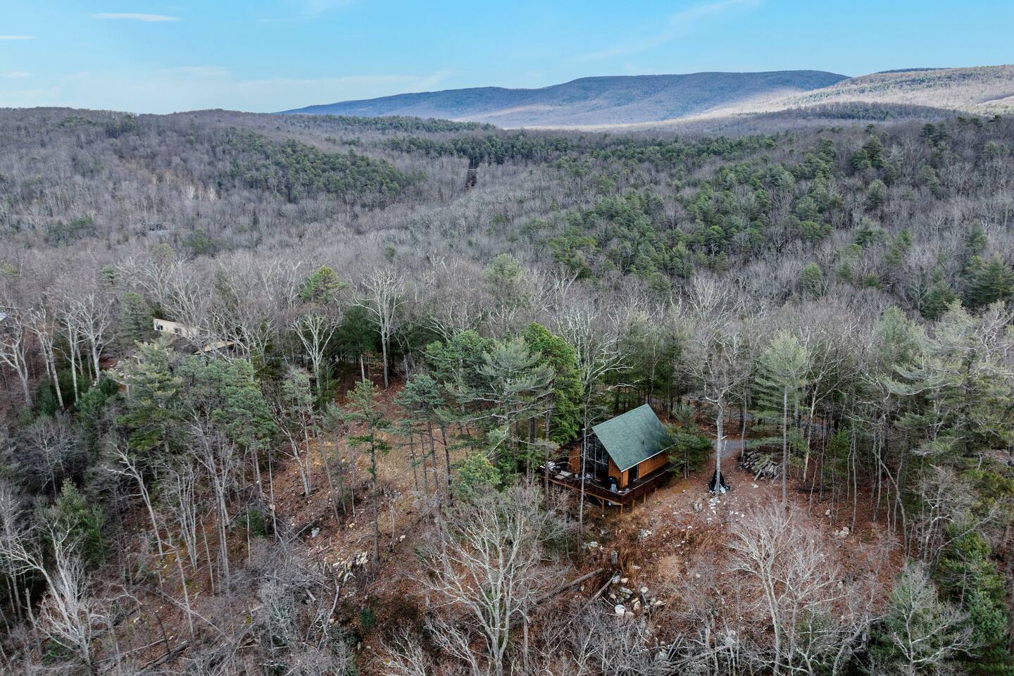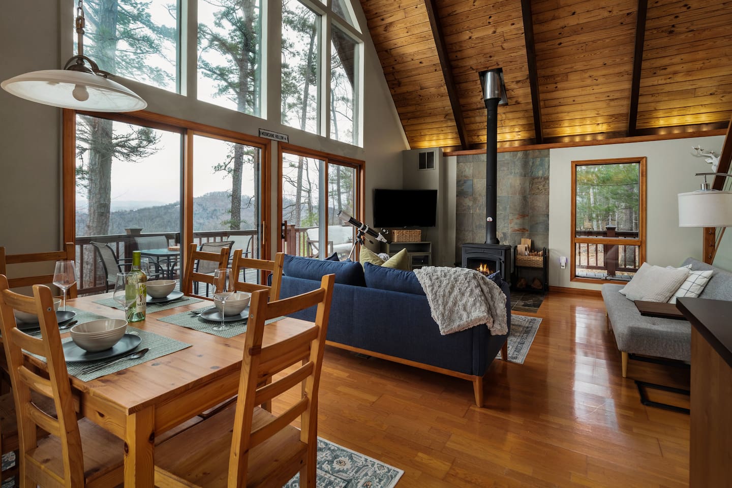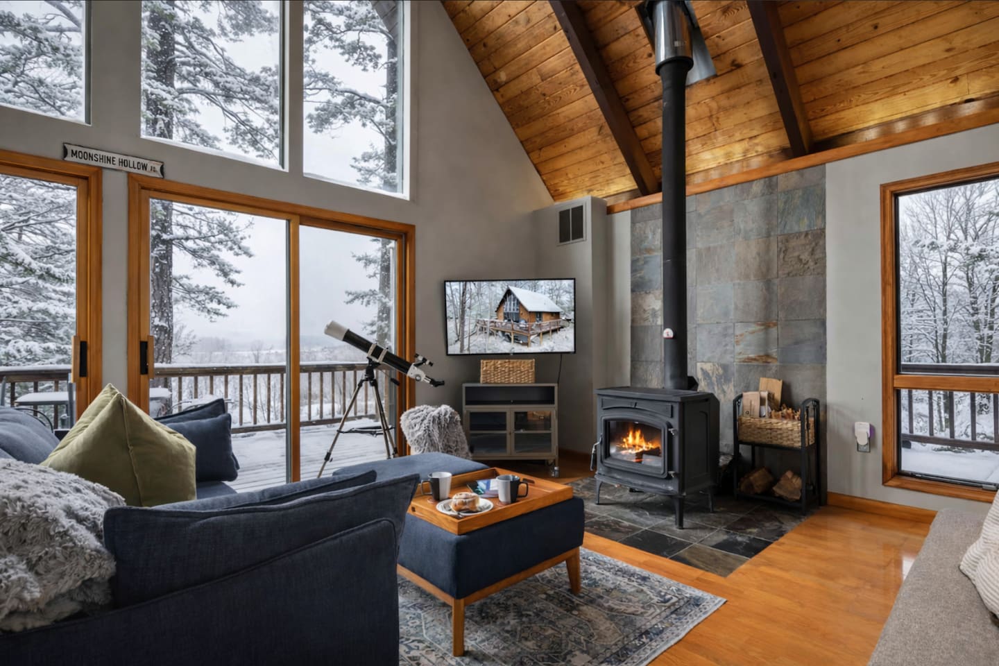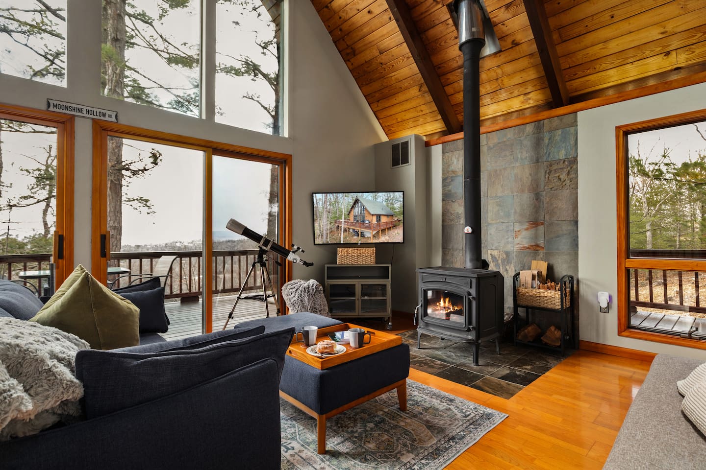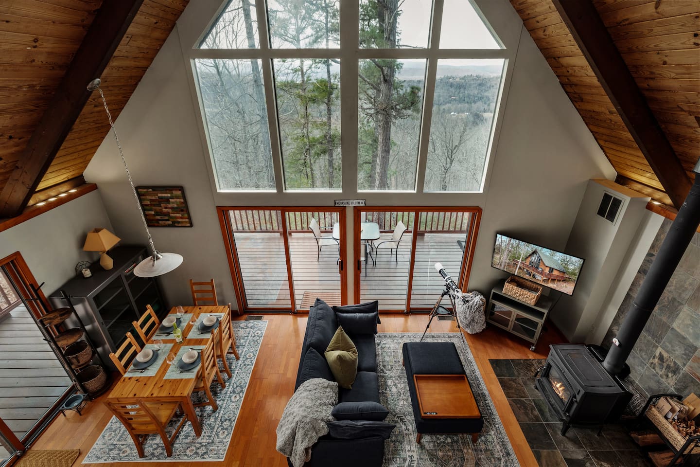 🌙 Moon View A-Frame | Mountain Views, Cozy & Quiet 🌙 As you wind up the mountain road, the trees open just enough to reveal long, rolling ridgeline views. Moon View A-Frame sits quietly among the forest, elevated for privacy and perfectly positioned for sunsets, moonrise, and star-filled nights. Mornings begin with light pouring through the expansive windows, coffee in hand, and nothing but mountains stretching into the distance. Evenings slow down by the fire—inside or out—where the quiet feels intentional and deeply calming. Living Space Moon View A-Frame comfortably sleeps up to 6 guests and is ideal for couples, families, or small groups seeking a peaceful mountain escape. The open-concept living space features vaulted wood ceilings, classic A-frame architecture, and large picture windows that frame the surrounding forest and distant mountain views. Natural light fills the cabin throughout the day, creating a warm, inviting atmosphere year-round. Sleeping Arrangements The cabin offers three thoughtfully designed bedrooms: - Bedroom 1 (Main Level): Queen bed with forest views - Bedroom 2 (Upper Level): Full size bed tucked under the A-frame ceiling - Bedroom 3 (Upper Level): Full size bed tucked under the A-frame ceiling Each room features cozy bedding, warm wood accents, and a quiet, restful feel. Indoor Living - Indoor spaces are designed for slow mornings and cozy winter nights. The living area centers around a wood-burning stove, perfect after chilly hikes or snowy days. Guests can relax with Smart TV, books, and board games, or take advantage of the telescope for moon and stargazing through the large windows. - High-speed Wi-Fi supports streaming or remote work, making this a great off-season retreat. Kitchen & Dining The fully equipped kitchen is designed for easy meals and relaxed gatherings, featuring: - Stainless steel appliances - Ample counter space - Bar seating - Dining table with forest and mountain views - Whether you’re cooking dinner or enjoying a slow breakfast, the kitchen flows seamlessly into the living space. Outdoor Living - Step onto the spacious deck to take in sweeping mountain views that feel especially dramatic in late winter and early spring. Start your day with sunrise coffee, watch the fog lift from the valleys, or settle into Adirondack chairs as the light fades. - Next to the A Frame, the outdoor fire pit creates the perfect spot for evening gatherings, marshmallows, and stargazing. With minimal light pollution, the night sky here is exceptionally clear. Nearby Highlights - Trout Pond Recreation Area – WV’s only natural lake, perfect for quiet walks and photography - GW National Forest – hiking, wildlife spotting & peaceful winter trails - Lost River State Park – scenic overlooks & forest exploration - Canaan Valley & Bryce Resort – skiing, snowboarding & tubing day trips - Dolly Sods & Seneca Rocks – iconic West Virginia landscapes - Wardensville & Woodstock – local dining, coffee shops & small-town charm Property Highlights - Rolling mountain and forest views - Classic A-frame architecture - Wood-burning stove - Large windows with abundant natural light - Outdoor fire pit with seating - Telescope for stargazing & moon viewing - High-speed Wi-Fi for streaming or remote work - Washer & dryer - Self check-in - Peaceful, private setting with abundant wildlife